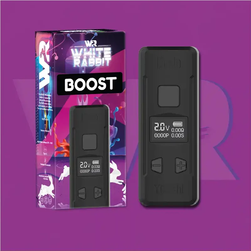 A bateria White Rabbit Boost é compatível com os cartuchos (recargas) 510. A tela OLED permite ajustar suas configurações para uma experiência personalizada.