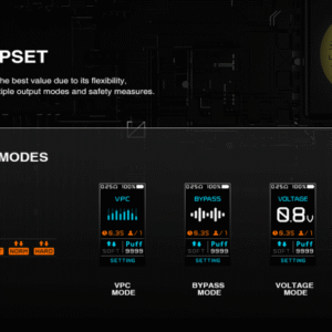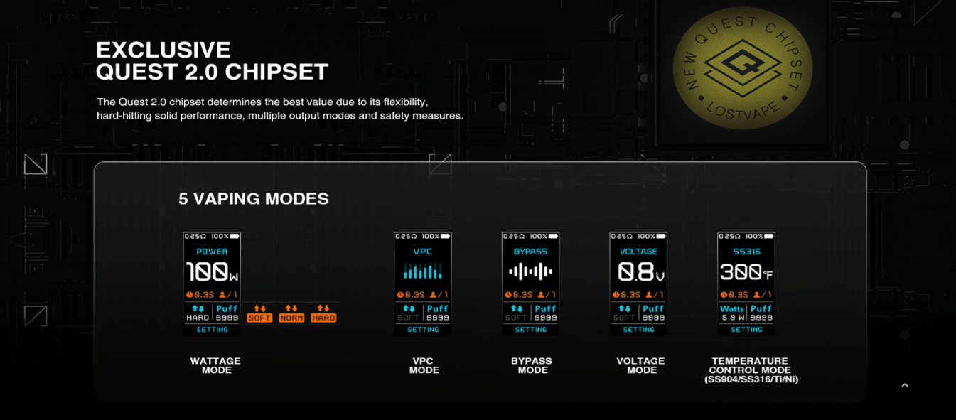 Para isso, a Centaurus Quest BF 100W pensa grande com um chipset Quest 2.0 que oferece uma grande tela colorida, bem como 5 modos de vapor para todas as configurações: